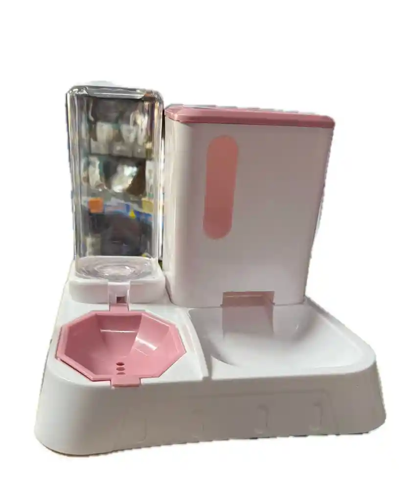 comedero con dispensador de agua y de alimento seco en color Rosado