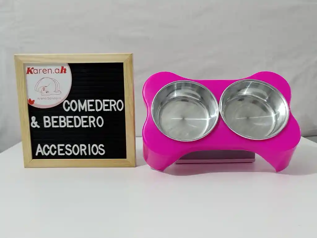 Dos recipientes metalicos de 11cm de diametro cada uno, base plástica de 24cm, altura de 6cm. Prácticos y fáciles de limpiar.