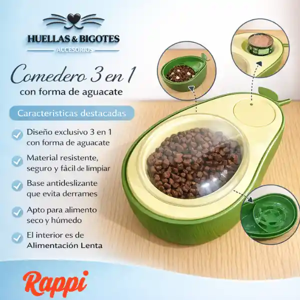 Hermoso, divertido y resistente comedero 3 en 1 en forma de aguacate. Comedero normal Comedero lento Espacio para alimento húmedo