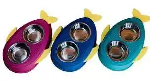 Hermoso bebedero y comedero para gatos y perros en forma de pez, dos puestos para el agua y el concentrado. Material: plástico y acero inoxidable