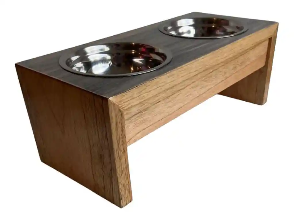 Comedero/bebedero en cedro con sellador y laca catalizada, base superior en acabado con pintura técnica decape color Gris, Cocas en aluminio de 14 cm de diámetro x 4.5 de profundidad. Alto: 15 cm