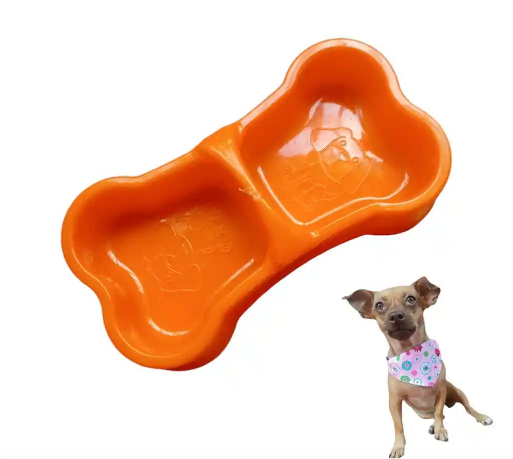 Práctico comedero mini en forma de hueso para perros y gatos color naranja, ideal para tu mascota pequeñita.