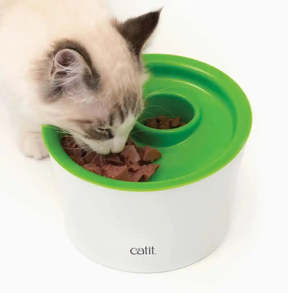 Catit Multi Feeder Comedero elevado ergonómico con agujero antivoracidad incorporado El Catit Multi Feeder anima a tu gato a sacar gradualmente pequeñas porciones de comida seca del agujero del centro. Cuenta con un plato elevado que es poco profundo y por lo tanto no toca los bigotes de tu gato y un espacio de almacenamiento integrado para la comida de tu gato.