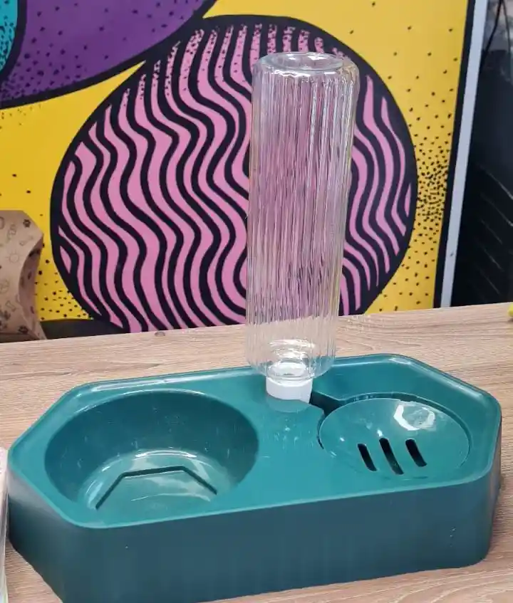 Comedero para mascotas con plato y una botella dispensadora de agua. - Un espacio plástico - La botella es transparente y se acopla a la base.