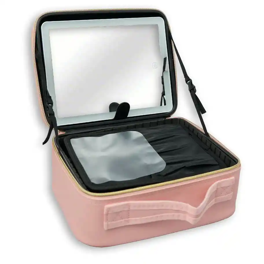 * Estuche de maquillaje portátil con espejo. * Espejo inteligente con iluminación LED de 3 modos. * Tamaño compacto y construcción liviana. * Almacenamiento de cosméticos multifuncional y divisiones removibles. * Material de alta calidad. * El espejo LED tiene una batería de litio recargable incorporada y se alimenta por USB.