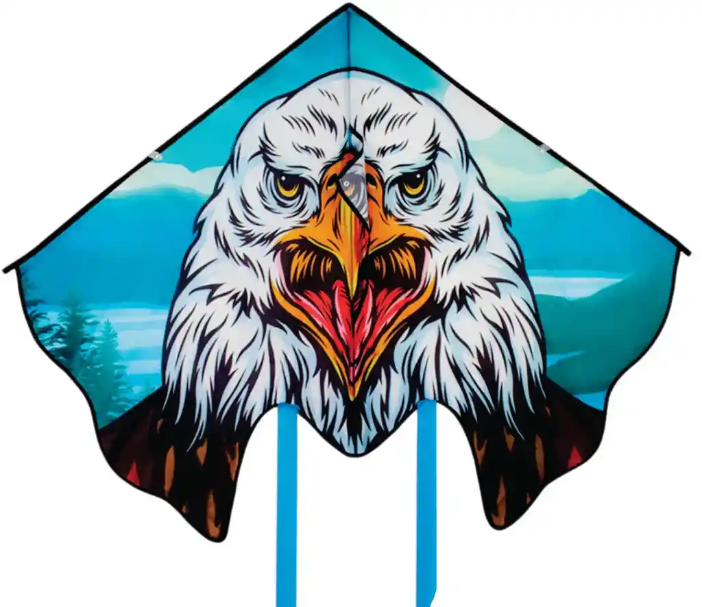Cometa Triangular: AGUILA Azul Material: Tela satín poliéster resistente al agua y al viento Estructura: flexible, resistente a impactos Medidas Ancho: 130cm Altura: 90cm