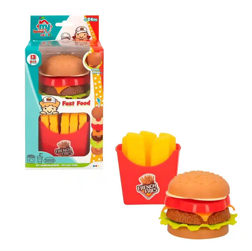 El set de Fast Food My Home Colors es un divertido juego de imitación que incluye una hamburguesa armable con todos sus ingredientes y un práctico recipiente de papas fritas, ideal para que niñas y niños mayores de 2 años disfruten creando su propio menú mientras desarrollan la imaginación, el juego de roles y la motricidad fina; un juguete colorido y seguro que convierte cualquier momento en una experiencia llena de diversión. Ficha Tècnica: Dimensiones: 8 cm x 6 cm x 6 cm Material : Plástico ABS no toxico Edad recomendada: + 3 años Certificado de conformidad: SL-CS-210044 Referencia: 614-2 Términos de Garantía: Para defectos de fábrica o retractos: Por favor revise el producto apenas lo reciba y antes de usarlo. No aplican ley de retracto o defectos de fábrica luego de usar el producto. Se manejan máximo 5 días para reportar defectos de fábrica (por ejemplo, producto funciona mal, piezas faltantes, rotas, etc).