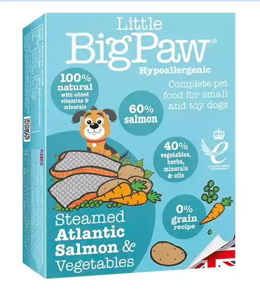 Little Big Paw Terrina de verduras y salmón del Atlántico al vapor Comida húmeda para perros rica en proteínas y sin cereales.