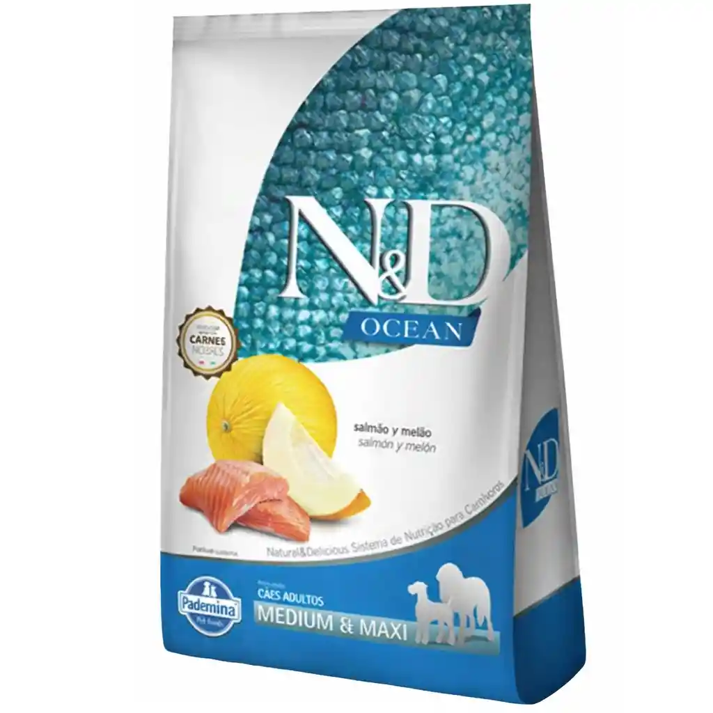Es un alimento seco súper premium, formulado científicamente para cubrir las necesidades nutricionales específicas de perros adultos de razas medianas y grandes. Pertenece a la línea N&D Ocean, caracterizada por utilizar proteínas de origen marino como alternativa altamente digestible y nutritiva frente a las proteínas tradicionales. Gracias a su combinación de ingredientes naturales, tecnología avanzada de conservación y ausencia de granos, este alimento proporciona una dieta equilibrada que contribuye a la salud integral del perro, favoreciendo su vitalidad, fuerza muscular, digestión y bienestar general. Características Proteína principal de origen marino: elaborado con salmón fresco y deshidratado, fuente de proteína de alta calidad y excelente digestibilidad. Fórmula Grain Free: libre de cereales como trigo, maíz o arroz, reduciendo el riesgo de alergias e intolerancias alimentarias. Especial para razas medianas y grandes: croqueta diseñada para facilitar la masticación y promover una correcta higiene dental. Ingredientes naturales seleccionados: incluye frutas y vegetales como el melón, que aportan vitaminas, antioxidantes y sabor natural. Alta palatabilidad: su sabor a salmón resulta atractivo incluso para perros exigentes. Conservación natural: utiliza antioxidantes naturales que protegen los nutrientes sin necesidad de conservantes artificiales. Libre de colorantes artificiales: mantiene la pureza y calidad del alimento. Beneficios Salud de piel y pelaje: los ácidos grasos Omega 3 y Omega 6 ayudan a mantener una piel hidratada y un pelaje brillante y fuerte. Óptima digestión: la alta calidad de las proteínas marinas y la ausencia de granos favorecen una digestión más ligera y eficiente. Fortalecimiento del sistema inmunológico: los antioxidantes naturales, vitaminas y minerales ayudan a reforzar las defensas del organismo. Mantenimiento de la masa muscular: el alto valor biológico del salmón contribuye a conservar músculos fuertes y saludables. Ideal para perros sensibles: recomendado para perros con intolerancias alimentarias o sensibilidad a proteínas cárnicas convencionales. Energía balanceada: aporta los nutrientes necesarios para mantener un nivel de energía adecuado sin provocar sobrepeso. Bienestar general: contribuye a una vida activa, saludable y prolongada. Ingredientes Principales Salmón fresco y salmón deshidratado: fuente principal de proteína, rica en aminoácidos esenciales. Harina de pescado: aporta proteínas concentradas y altamente digestibles. Melón deshidratado: fuente natural de vitaminas, minerales y antioxidantes. Aceite de pescado: rico en Omega 3 para la salud cardiovascular, cutánea y cognitiva. Fibra vegetal natural: favorece el tránsito intestinal y la salud digestiva. Vitaminas y minerales quelados: mejor absorción y aprovechamiento nutricional. Antioxidantes naturales: ayudan a proteger las células frente al envejecimiento.