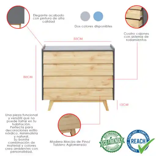 Comoda o Mueble Organizador Tocancipa , perfecta para completar la decoración de tu cuarto. Además de ser una pieza de gran belleza gracias a su diseño sencillo, dispone de 4 cajones para almacenar ropa, toallas o sábanas en tu habitación y así, siempre mantengas el orden. Producto eco friendly, Nature está fabricada en madera. Disponible en tres colores para que le des un toque personal a tu habitación: blanco, azul cielo o gris. Todos ellos combinados con el color natural crean un ambiente acogedor. Encaja con facilidad en cualquier estilo decorativo, especialmente nórdico, actual, minimalista o natural. Móntala sin complicaciones y elimina la suciedad de su superficie con un trapo seco. Consigue con Nature un plus de almacenamiento y organización.