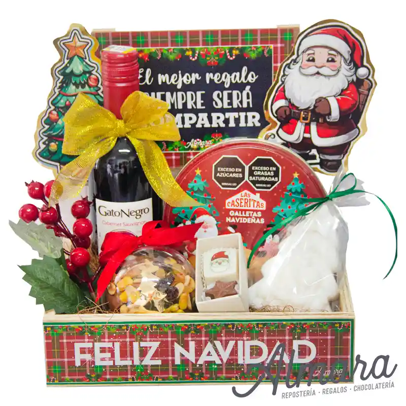 Canasta de madera decorada con papeleria creativa Botella de vino 375ml Tarro de lata con galletas Bola con mixtura de nueces Caja de 2 Bombones de chocolate navideños Vela en forma de arbol con pesebre en la parte interna muerdago navideño decorativo Galletas,desayuno,mixtura,bombones,vela