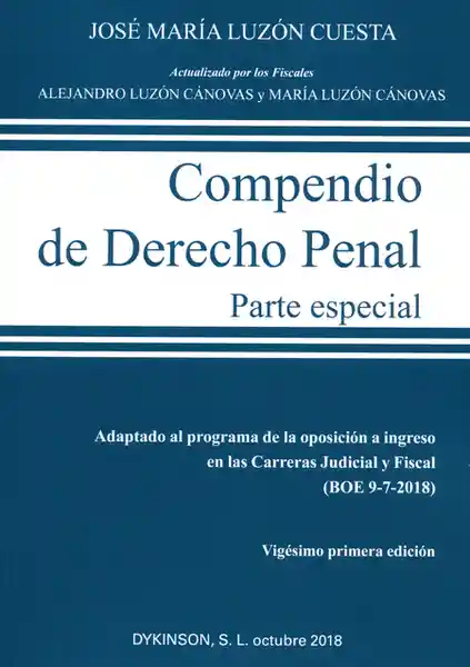 José María Luzón Cuesta. Editorial: Dykinson. Año: 2018. El Homicidio. El Asesinato. La Eutanasia. / el Delito de Aborto. / Las Lesiones. Violencia de Género. / Delitos Contra la Libertad. / Acoso Sexual. / Omisión Del Deber de Socorro. / Delitos Contra el Honor. La Calumnia. La Injuria. / Matrimonios Ilegales. / Delitos Contra el Patrimonio y Contra el Orden Socioeconómico. / Las Defraudaciones. / Insolvencias Punibles. / Delitos Relativos a la Propiedad Intelectual e Industrial. / Delitos Societarios. / Delitos Contra la Hacienda Pública. / Delitos Sobre la Ordenación Del Territorio. / Delitos Contra la Seguridad Colectiva. / Delitos Relativos a Drogas Tóxicas. / Delitos Contra la Seguridad Vial. / Las Falsedades. / Cohecho. Derecho. Derecho Penal. ISBN: 9788491488446
