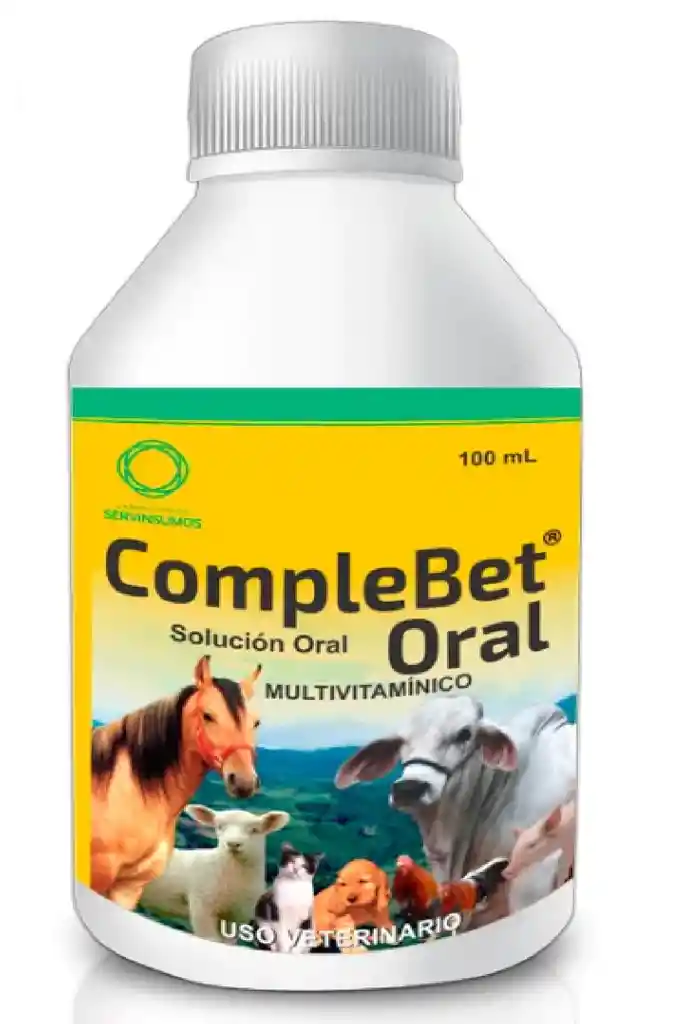 Útil además para controlar los cuadros anémicos, incluidos los producidos por hematozoarios. Especies: Bovinos, equinos, porcinos, ovinos, caprinos, caninos, felinos. Presentación: 100 ml. COMPLEBET ORAL es una asociación de las vitaminas esenciales del complejo B con Glicerofosfatos, lo cual lo hace eficaz para el tratamiento de las enfermedades y trastornos orgánicos producidos por la deficiencia de estas vitaminas, además de ejercer un efecto tónico estimulante del metabolismo, lo cual se refleja en una recuperación más rápida de las enfermedades.