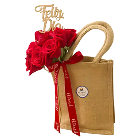 Escribe tu dedicatoria en comentarios. Bolsita en yute fina con ramillete de 12 rosas(color a escoger), cinta de tela y topper decorativo (confirmar existencia) e incluye tarjeta.