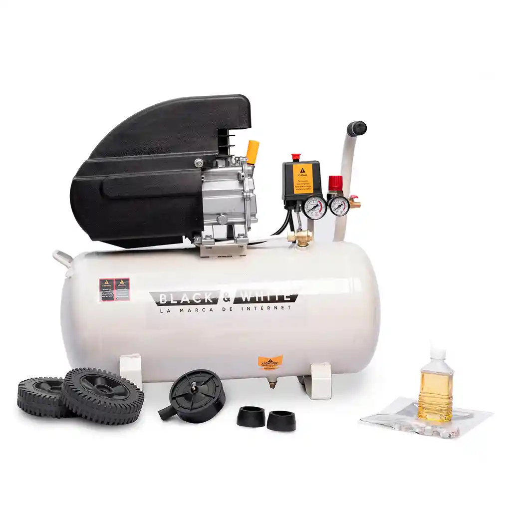 Compresor de aire de 40lts 115 PSI 2HP/1500W. Voltaje 120V, caudal de aire 220L/min. Tiene dos salidas de aire. Incluye un tarro de aceite, filtro de aire, juego de empaques, ruedas, soporte de caucho, tubo de respiracion y manometro.