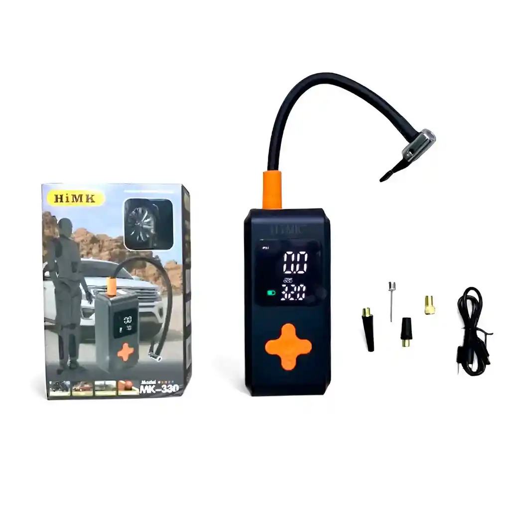 Este compresor de aire portátil e inalámbrico HiMK MK-330 es la herramienta esencial para cualquier conductor o deportista, permitiendo inflar neumáticos de autos, motos, bicicletas y balones con total precisión gracias a su pantalla digital y función de parada automática al alcanzar la presión deseada. Su diseño compacto y ergonómico incluye una batería recargable mediante USB, linterna LED integrada para emergencias nocturnas y cinco modos preestablecidos que facilitan su uso en múltiples situaciones, garantizando seguridad y eficiencia en un dispositivo que cabe en la palma de tu mano. FICHA TÉCNICA Modelo: MK-330 Presión máxima: 150 PSI Flujo de aire: 25L / min Voltaje de operación: 7.4V Entrada de carga: USB Tipo C (5V/2A) Capacidad de la batería: 4000 mAh (2000 mAh x 2) Modos de uso: Automóvil, Moto, Bicicleta, Balón, Personalizado Unidades de medida: PSI, BAR, KPA, Kg/cm2 Pantalla: Digital LCD con retroiluminación Iluminación: Linterna LED integrada Dimensiones: 13.5 cm x 8 cm x 4.8 cm Longitud de la manguera: 20 cm Accesorios incluidos: Cable de carga USB, Boquilla para neumáticos, Aguja para balones, 2 Adaptadores para inflables POLÍTICAS DE GARANTÍA Garantía de 1 mes por defectos de fábrica. No cubre daños ocasionados por mal uso, golpes, contacto con agua, sobrecargas eléctricas o si el sello de seguridad ha sido removido. Para hacer efectiva la garantía, el producto debe devolverse en su empaque original y con todos los accesorios incluidos en la ficha técnica. Los costos de envío por retracto o garantía corren por cuenta del comprador según las políticas de la plataforma.