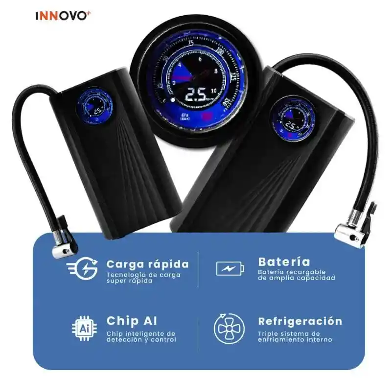 Mantén tus llantas y accesorios siempre inflados con este compresor de aire portátil eléctrico con pantalla digital. Su diseño compacto y recargable lo convierte en un aliado indispensable para el carro, moto, bicicleta o incluso balones, colchones inflables y flotadores. Gracias a su chip inteligente AI, detecta la presión exacta y se detiene automáticamente al alcanzar el nivel indicado. Su batería de alta capacidad y sistema de refrigeración interno garantizan seguridad, rapidez y durabilidad. Ideal para viajes, emergencias y uso diario. ¡Llévalo contigo y olvídate de quedar varado por falta de aire! Ficha Técnica Tipo: Compresor de aire portátil eléctrico Pantalla: Digital de alta precisión Material: Plástico ABS + componentes metálicos resistentes Medidas: 18 cm de alto x 8.5 cm de ancho Presión máxima: 150 PSI Tecnología: Chip AI de detección automática Batería: Recargable de gran capacidad Carga: Puerto USB de carga rápida Manguera: 3 capas reforzadas (goma, nailon y capa protectora) Usos: Carro, moto, bicicleta, balones, colchones y flotadores Beneficios Multifuncional: Infla desde llantas hasta accesorios deportivos. Precisión digital: Pantalla que muestra presión exacta en tiempo real. Seguridad garantizada: Apagado automático al alcanzar la presión indicada. Alta resistencia: Manguera reforzada a prueba de explosiones y anticongelante. Portátil y recargable: Llévalo en el carro, moto o mochila sin ocupar espacio. Rendimiento superior: Sistema de refrigeración interno que evita sobrecalentamiento.