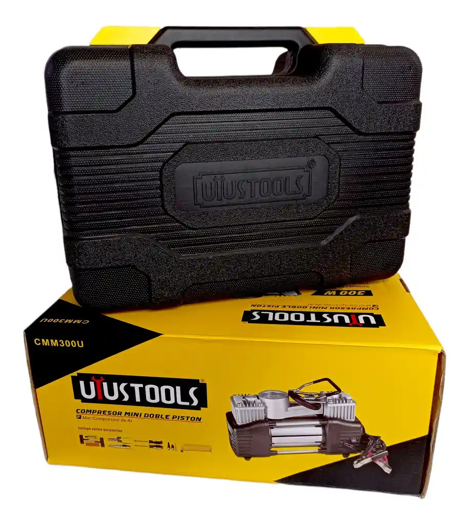 • Compresor Mini Doble Pistón 300W Uyustools • Compresor de Aire 12 Volts que funciona conectado a la batería de auto 12 volts (positivo y negativo). • Doble cilindro, cuerpo de metal con empuñadura manómetro y doble filtro de aire • Rotor de cobre con 88 laminas en acero de silicio • Presión máxima: 150 PSI (libras) ó 10 BAR por minuto (carga super rápida) • Amperaje máximo: 23 Amperios • Presión de aire máxima 150psi • Flujo de aire máximo 60 litros por minuto • Largo de la manguera: 5 metros • Linterna de 5 leds • Medidas: 20 cm de largo x 10 cm de ancho x 20 cm de alto • Incluye Kit de herramientas: - 1 Manguera espiral x 5 mts con acoples rápidos - 3 Boquillas - 1 Destornillador PH2 x 6 x 100mm - 1 Destornillador 1.0 x 6 x 100mm - 1 Alicate universal de 6" - 1 Bisturí - 3 Parches - 2 Herramientas de mano para repara el neumático - 1 Tubo de pegamento PRECAUCION: • Esto no es un juguete. Manténgase fuera del alcance de los niños. • No inflar de forma excesiva para evitar accidentes. • Siempre utilice el adaptador adecuado. • Siempre consulte el manual del usuario para obtener rangos mas precisos de presión. • Si el compresor ha estado funcionando durante mas de 10 minutos , debes apagarlo y dejarlo enfriar para evitar daños en el equipo.