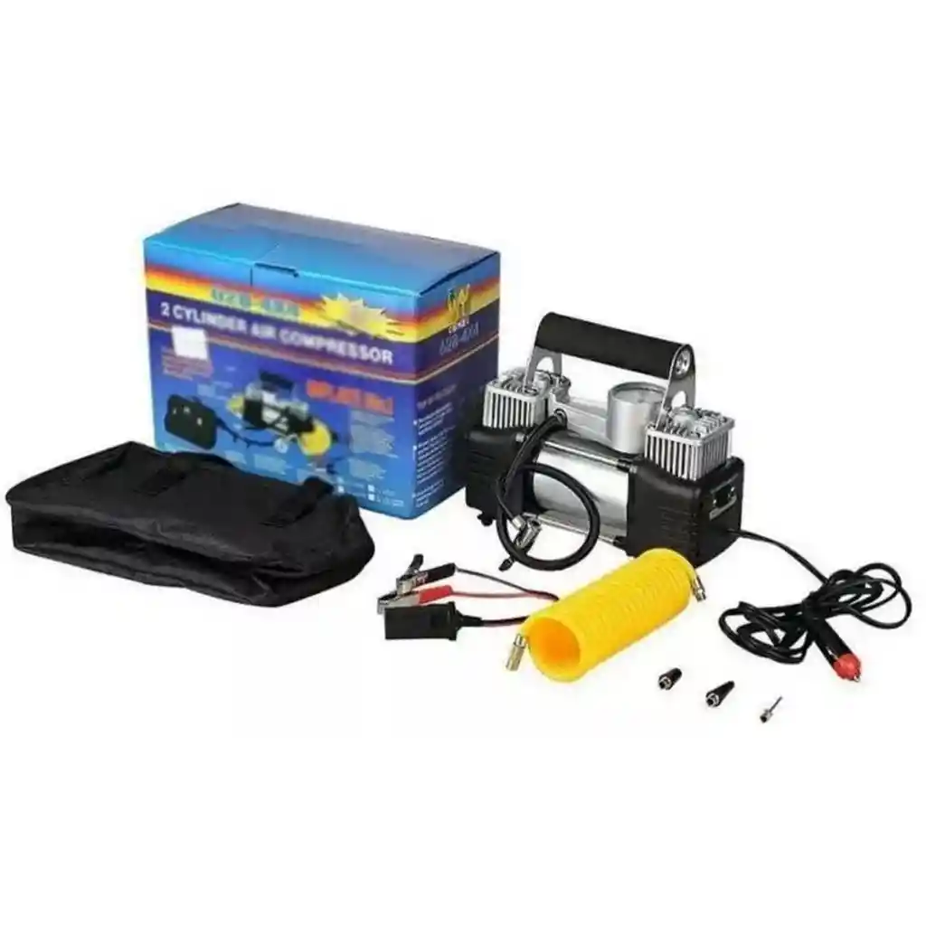 Este mini compresor de aire portátil es una herramienta ligera, compacta y potente, ideal para emergencias en carretera, viajes de campamento y el inflado de juguetes y equipos deportivos. Su diseño de doble cilindro mejora significativamente la eficiencia y velocidad de inflado, permitiendo llenar completamente un neumático en tan solo 8-10 minutos, con una presión máxima de 150 PSI. Incluye tres adaptadores para inflar balones, globos y otros elementos inflables, además de conectores versátiles que garantizan compatibilidad con distintos tipos de válvulas. Su construcción metálica robusta proporciona durabilidad y resistencia al uso constante, mientras que su fuente de alimentación de 13.8V asegura un rendimiento estable y eficiente. Equipado con una válvula de purga, protege el compresor al reducir la presión acumulada dentro del tanque y permite un desinflado rápido o un inflado preestablecido. Su diseño silencioso y libre de vibraciones, junto con su facilidad de almacenamiento y transporte, lo convierten en una opción confiable para diversas aplicaciones. Ficha Técnica: •Potente y portátil: Infla neumáticos en minutos, ideal para autos, motos, bicicletas y más. •Especificaciones: 12V DC (máx. 13.8V), 23A, flujo de aire 35-85L/min, presión máx. 150 PSI. •Diseño compacto: Aluminio y ABS, medidas 24.5 x 9.5 x 19 cm. •Conectividad: Cable de 3.6 m, manguera negra de 25 cm y manguera espiral de hasta 5 m. •Fácil uso: Se conecta a la batería con pinzas, interruptor ON/OFF, incluye 3 adaptadores y bolso de transporte. •Ciclo de trabajo: 40 min a 40 PSI (máx. 4 ruedas, luego descansar). ** _Para defectos de fábrica o retractos: \**_Por favor revise el producto apenas lo reciba y antes de usarlo. No aplican ley de retracto o defectos de fábrica luego de usar el producto. Se manejan máximo 5 días para reportar defectos de fábrica (por ejemplo, producto funciona mal, piezas faltantes, rotas, etc). Para hacer efectiva la devolución el producto debe devolverse con el empaque original, el cual debe estar en buen estado, incluir todos los documentos y las partes completas y sin daños.