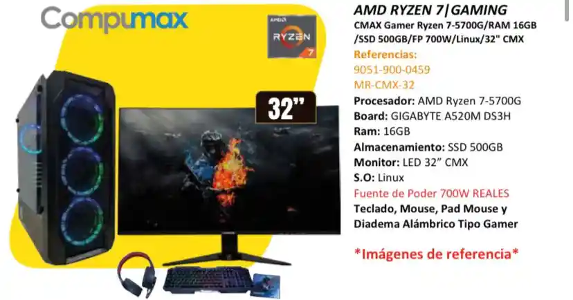 Procesador: AMD Ryzen 7-5700G Board: GIGABYTE A520M DS3H Ram: 16GB Almacenamiento: SSD 500GB Monitor: LED 32” CMX S.O: Linux Fuente de Poder 700W REALES Teclado, Mouse, Pad Mouse y Diadema Alámbrico Tipo Gamer EXPOTECNOLOGIA 3505945136