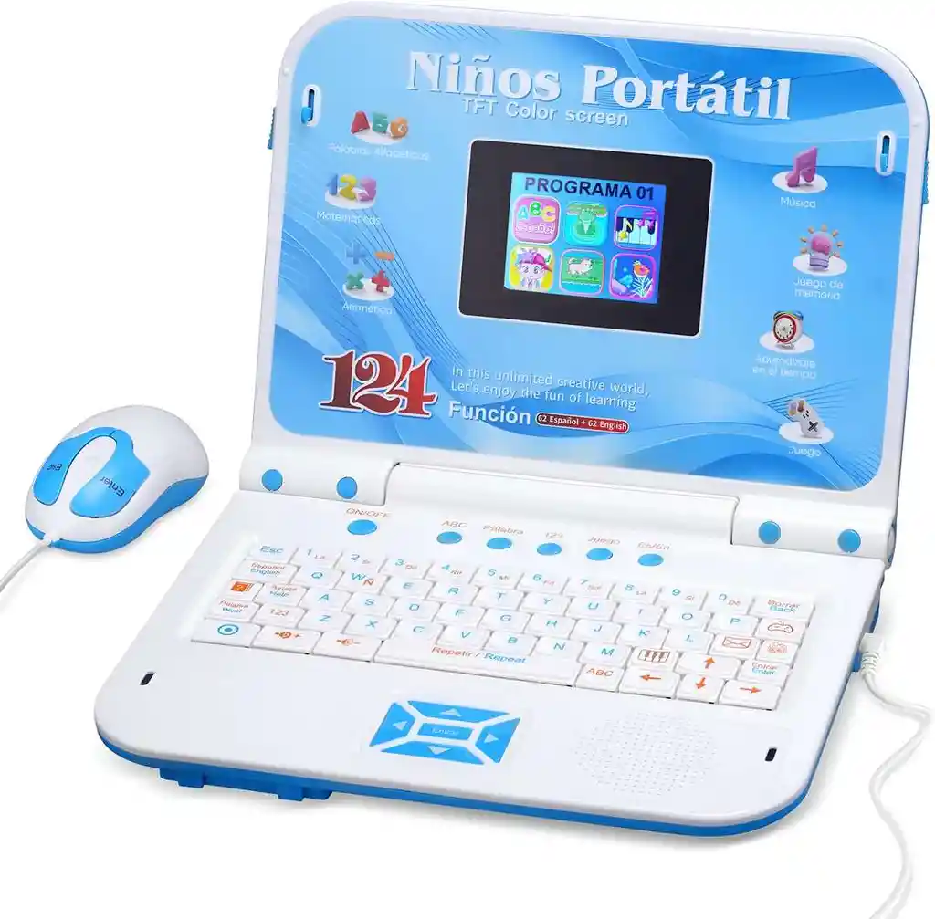 ¡Inicia la aventura del aprendizaje bilingüe con este fantástico computador "Niños Portátil"! Diseñado para que los pequeños se sientan como grandes, este laptop educativo cuenta con una vibrante pantalla TFT a color, un teclado QWERTY completo y un mouse ergonómico para una experiencia de navegación totalmente realista. Es una poderosa herramienta de aprendizaje cargada con 124 funciones (62 en español y 62 en inglés), que transforman el juego en educación. Desde explorar el alfabeto, resolver problemas de matemáticas y aritmética, hasta componer música, disfrutar juegos de memoria y aprender la hora, este computador es el compañero todo-en-uno perfecto para fomentar la curiosidad y el desarrollo de habilidades clave en dos idiomas. /// El juguete incluye baterías /// Ficha Técnica: Material : Plástico ABS Funcionamiento del control : 3 Baterías AA ( Incluida ) Edad Apto + 5 años Dimensiones : 26 cm x 20 cm x 3 cm Certificado de conformidad: E5-0359-2021 Referencia: BT-269ES ** _Para defectos de fábrica o retractos: \_Por favor revise el producto apenas lo reciba y antes de usarlo. No aplican ley de retracto o defectos de fábrica luego de usar el producto. Se manejan máximo 5 días para reportar defectos de fábrica (por ejemplo, producto funciona mal, piezas faltantes, rotas, etc). Para hacer efectiva la devolución el producto debe devolverse con el empaque original, el cual debe estar en buen estado, incluir todos los documentos y las partes completas y sin daños.