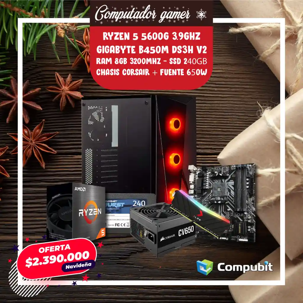 Ryzen 5 5600G 3.9Ghz Gigabyte B450M ds3h v2 Memoria Ram 8GB 3200MHZ RGB XLR8 SSD 240GB Patriot Brust Chasis Corsair SPEC DELTA Fuente CV650W 80+ Bronze