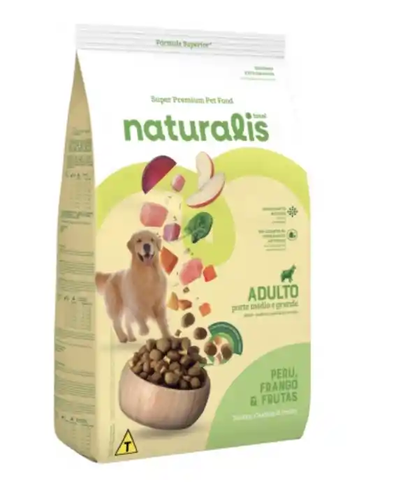 Naturalis Adult Medium and Large - Chicken Turkey Fruits, es un alimento super premium especial para perros adultos razas medianas o grandes, elaborado con proteínas seleccionadas de alta calidad. Tiene trozos de papaya y manzana, así como cereales integrales, extracto de espinaca, zanahoria y pulpa de remolacha que ofrecen un sabor diferente al paladar de los perros y aportan energía y vitalidad. Beneficios: 1. Balance de Omega 3 y 6 para favorecer la piel y el pelaje. 2. Con antioxidantes naturales que fortalecen el sistema inmunológico. 3. Heces más firmes, con menos volumen y olor gracias a la inclusión de Yuca.