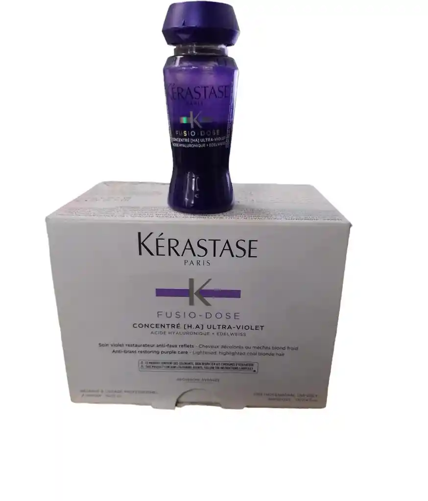 Kerastase Fusio-Dose Concentre [H.A] Ultra-Violet está destinado a revelar un rubio luminoso más frío y brillante y neutralizar instantáneamente los matices cobrizos y amarillos como principal preocupación y debe combinarse con el refuerzo de su elección para abordar una preocupación secundaria del cabello.
