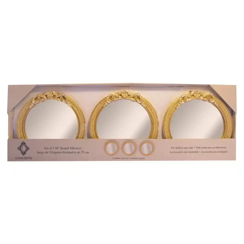 Set de Espejos Decorativos | Cantidad: 3 unidades | Diámetro de cada espejo: 25.4 cm / 10" | Ideal para embellecer espacios interiores | Diseño ligero y práctico para instalación sencilla | Construcción resistente para uso prolongado | Estética moderna acorde a estilos decorativos actuales | No recomendado para áreas exteriores |