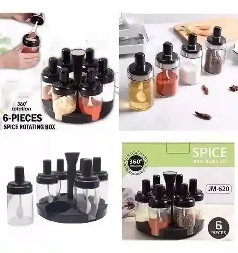 Organizador de especias x 6 puestos Acrílico Este organizador de especias brindará a tu cocina un toque elegante y despejado, sus 6 recipientes de material acrílico de alta calidad son de alta durabilidad fáciles de limpiar, además cada uno de ellos cuenta con una tapa giratoria de 3 posiciones para permitir filtrar desde avena en hojuela hasta granos finos de sal u orégano. Su diseño es giratorio de esta manera podrás alcanzar cada frasco sin problema alguno. «« CARACTERÍSTICAS PRINCIPALES »» Diseño giratorio para fácil acceso Tapa de tres aberturas de distintos tamaños Tamaño perfecto para ahorrar espacio en la cocina «« ELEMENTOS INCLUIDOS »» Base giratoria 6 Recipientes 6 Cucharas «« DIMENSIONES »» 16 cm x 16 cm