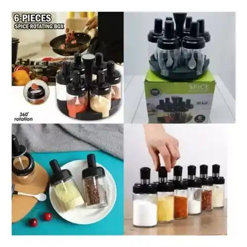 Quieres que tú cocina luzca organizada? Te tenemos la solución con este increíble organizador de especias, incluye 6 recipientes de material acrílico de alta calidad para que puedas guardar las especias de tu elección. Características - Son de alta durabilidad -Fáciles de limpiar, además cada uno de ellos cuenta con una tapa giratoria de 3 posiciones para permitir filtrar desde avena en hojuela hasta granos finos de sal u orégano. -Su diseño es giratorio de esta manera podrás alcanzar cada frasco sin problema alguno. Incluye -Base giratoria -6 Recipientes -6 Cucharas