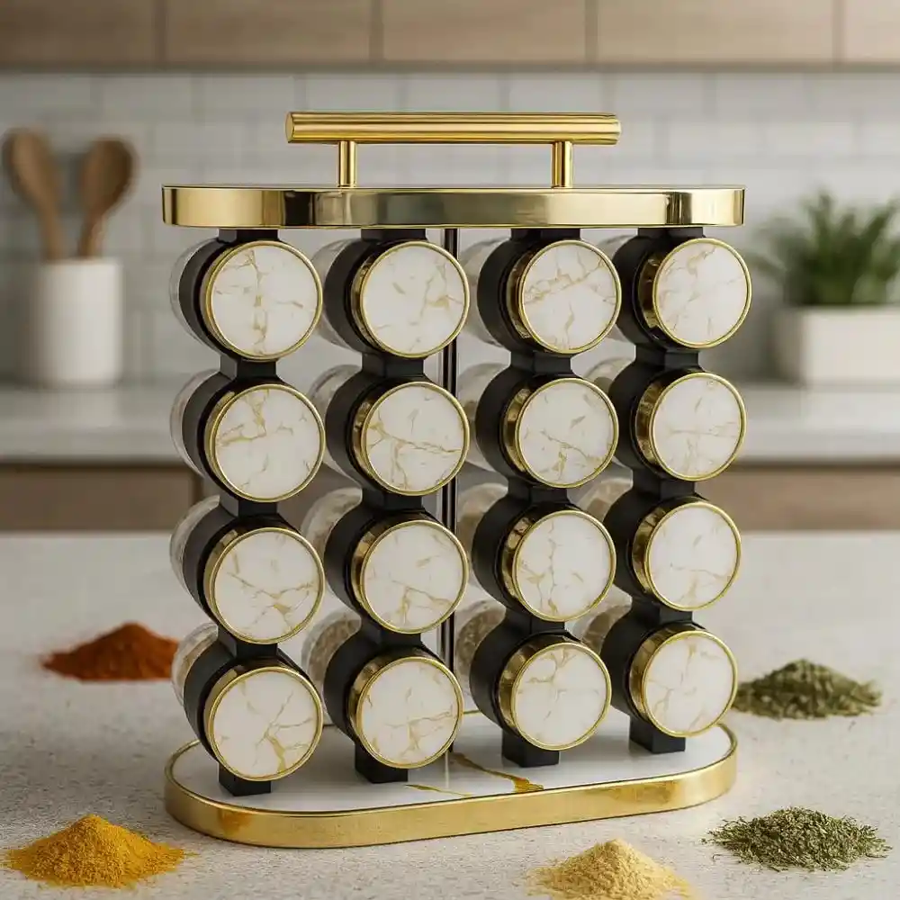 mármol lo convierte en un accesorio funcional y decorativo que realza cualquier cocina. Cada frasco tiene una capacidad de 16 mililitros, ideal para mantener tus condimentos frescos y siempre visibles. Gracias a su base giratoria, podrás acceder fácilmente a cada especia sin perder tiempo mientras cocinas. Su tamaño compacto de 27 centímetros de alto lo hace perfecto para cualquier espacio, sin ocupar demasiado lugar en la encimera. Este especiero está pensado para quienes buscan orden, eficiencia y estilo en un solo producto. Es una excelente opción para uso personal o como regalo útil y sofisticado para amantes de la cocina. Mejora tu experiencia culinaria con un organizador que combina diseño y funcionalidad. Incluye 16 frascos de vidrio con tapa efecto mármol Capacidad de 150 mililitros por frasco Base giratoria de 27 cm de alto Diseño elegante con detalles dorados Estructura compacta y resistente No extensible, sin soporte para papel Lo que obtienes en la compra 1 x Condimentero 16 x Fracos de Vidrio