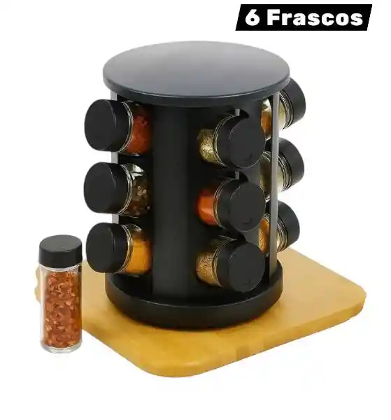 Acceso inmediato: base giratoria 360° para elegir la especia justa en segundos. Frescura y orden: frascos con tapa a rosca y dosificador interno. Higiene simple: frascos aptos para lavavajillas y fáciles de recargar. Diseño compacto: optimiza espacio con estética moderna en negro. Durabilidad: materiales de primera calidad para uso diario. Material: Acero inoxidable (estructura) + vidrio (frascos) Color: negro (estructura y tapas) Función: giratorio 360° sobre mesada Incluye: 6 frascos de 90 ml con tapa negra y dosificador Limpieza: frascos aptos lavavajillas Presentación: producto nuevo, cerrado en caja