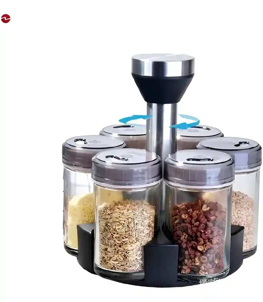 Características Principales: Organización: Ideal para almacenar y organizar especias, hierbas y condimentos en la cocina. Funcionalidad: Cuenta con una base giratoria de 360° que permite un acceso fácil y rápido a cualquiera de los frascos. Componentes: El set incluye 6 frascos de vidrio con tapas y una base central (lo que suma 7 piezas en total). Materiales: Los frascos suelen ser de vidrio transparente para ver el contenido, con tapas que pueden ser de acero inoxidable o plástico, y la base también suele ser de materiales mixtos para resistencia y diseño moderno. Diseño: Su diseño compacto y moderno ahorra espacio en la encimera y se integra bien en cualquier estilo de cocina.