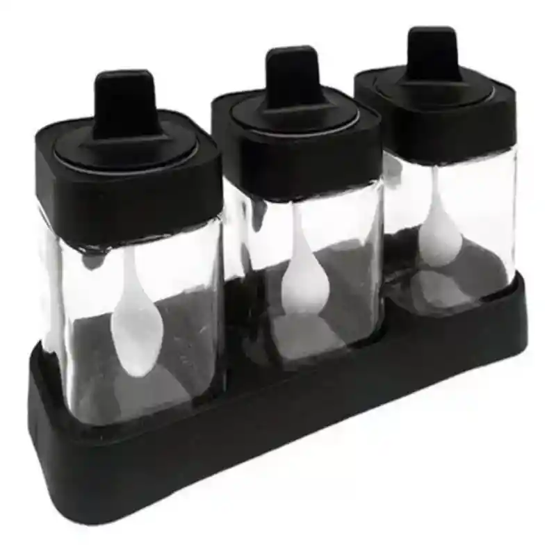 El soporte para condimentos es adecuado para almacenar varios condimentos, lo que hace que la comida sea fácil y conveniente. La cubierta está integrada con el cuerpo de la botella, mantiene tu fresco, prevención, protección contra la humedad y el condimento de las otras cosas sucias. Es fácil de limpiar. Ayudante perfecto para almacenar condimentos de cocina. Se puede utilizar para contener una variedad de condimentos: pimienta, azúcar, sal. Especificaciones -Color: Negro. -Material: Plástico. -Diseño: Caja de condimentos 3 en 1. -Capacidad: 400ml. -Medida frascos: 8 cm x 8 cm x 11.5 cm. -Función: Almacenamiento de condimentos, pimienta, sal, azúcar, especias, etc. -Aplicación: cocina.
