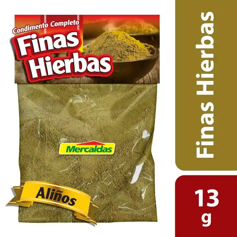 Condimento completo finas hierbas aliños Mercaldas. Presentación: 1 bolsa por 13 gramos.