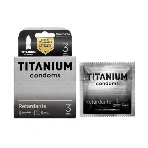 Retarde su orgasmo mientras disfruta de un sexo seguro con los Condones Titanium Retardante x 3 Una composición delgada en látex para un mayor placer Creado con lidocaína y benzocaína, este condón hará que su eyaculación se tarde un poco más, haciendo que pueda sentir mucho más y alcanzar el éxtasis total con su pareja durante el acto sexual. Ambos componentes actúan como analgésico, esto quiere decir, que durante el acto soportará una mayor estimulación y su eyaculación será tardía. Cuenta con líneas texturizadas que harán que su compañero obtenga una satisfacción completa y a la vez, al tener una de las texturas más delgadas, podrá ofrecerle las sensaciones más reales. Características de los Condones Titanium Retardante x 3 Brinda un efecto retardante para retrasar la eyaculación Ofrece un placer prolongado Diseño con líneas texturizadas Fabricado con látex premium para misma seguridad y resistencia Electrónicamente testeado Lubricado con lidocaína y benzocaína de larga duración que actúan como retardantes sexuales Posee depósito de fluidos en la punta Presentación: 3 unidades Forma: acanalado y paralelo Textura: punteado y acanalado Medidas Ancho: 53 mm de diámetro Espesor: 0.06 – 0.09 mm INVIMA: 2021DM-0022827 Excede los estándares internacionales de calidad Cuidados de los Condones Titanium Retardante x 3 Este producto contiene látex de goma natural, el cual puede causar reacciones alérgicas. Suspenda su uso en caso de presentar alergias en sus componentes. Si presenta dificultad respiratoria o labios azules durante el uso de este producto, contacte de inmediato a su médico y no use el producto nuevamente. No es testeado en animales. No utilice este producto con lubricantes a base de aceite como del de petróleo o petrolato, aceite vegetal, mineral o cremas, ya que puede dañar el preservativo. Abrir solamente en el momento de su uso. Tenga presente que es un producto de un solo uso. Deseche este luego de su uso (no arrojar al inodoro). Su mal uso, puede provocar daños o que este no permanezca en su lugar. Si se usa apropiadamente puede ayudar a reducir el riesgo de embarazos no deseados y/o contagio de enfermedades de transmisión sexual (ETS). Guarde en un lugar fresco y seco donde no le dé luz del sol. Conservar a una temperatura menor a 30°C
