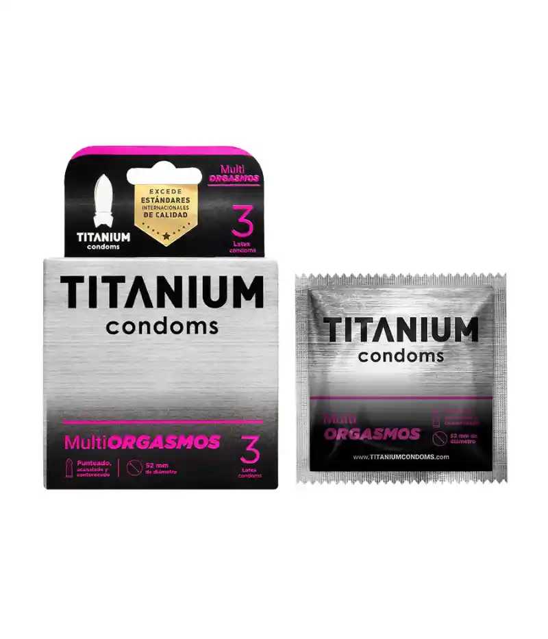 Logra el triple de sensaciones para que deslumbre en la cama con los Condones Titanium Multiorgasmos x 3. Cómodos, seguros y extra finos para un mayor sensación Con textura de puntos y estrías, este condón ofrece un placer extremo en pareja y brinda las sensaciones más intensas durante la relación sexual. Es desarrollado con L-Arginina, un componente que brinda un efecto estimulante en la mujer e incrementa el deseo sexual al ser un vasodilatador natural, lo que hará que, durante su uso, ambos reciban el triple de sensaciones para alcanzar el clímax con facilidad. Está hecho en látex premium, su forma es acanalada, contorneado y tiene una punta con depósito de residuos para mejorar la experiencia íntima. Características: - Contenido: Contiene 3 unidades - Cuidado: Este producto contiene látex de goma natural, el cual puede causar reacciones alérgicas. Si presenta dificultad respiratoria o labios azules durante el uso de este producto, contacte de inmediato a su médico y no use el producto nuevamente. NO testeado en animales. - Marca: Titanium - Material: Fabricado con látex premium para la máxima seguridad y resistencia - Registro sanitario invima: 2021DM-0022827 - Lubricado con L-Arginina, para un aumentar la libido femenina - Diseño con líneas texturizadas - Electrónicamente testeado - Posee depósito de fluidos en la punta - Forma: punteado, acanalado y contorneado. CONFIDENCIALIDAD: ¡Guardamos tus secretos con amor! En Sexfrodita, nuestros envíos son como pequeños misterios llenos de placer. Sin logos ni marcas, ¡solo tú descubrirás el contenido cuando abras el paquete!
