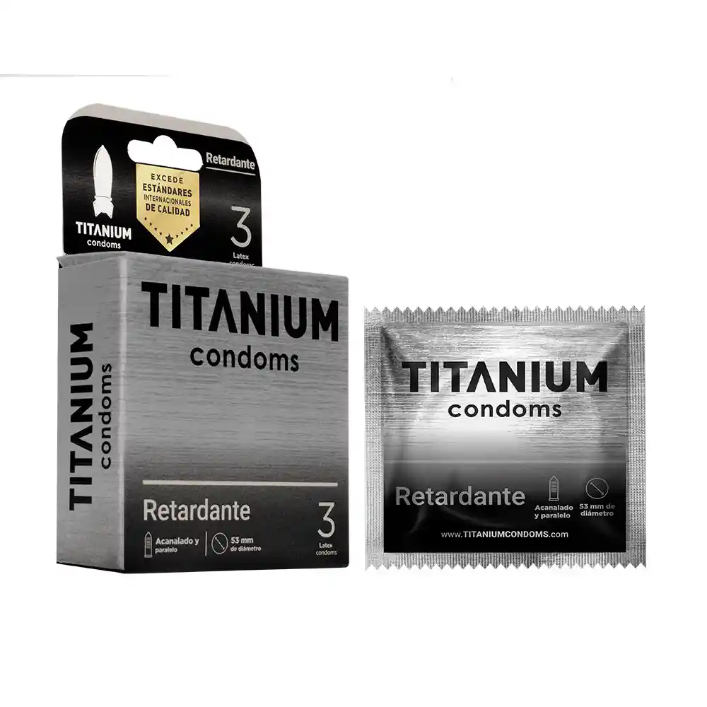 Retarde su orgasmo mientras disfruta de un sexo seguro con los Condones Titanium Retardante x 3 Una composición delgada en látex para un mayor placer Creado con lidocaína y benzocaína, este condón hará que su eyaculación se tarde un poco más, haciendo que pueda sentir mucho más y alcanzar el éxtasis total con su pareja durante el acto sexual. Ambos componentes actúan como analgésico, esto quiere decir, que durante el acto soportará una mayor estimulación y su eyaculación será tardía. Cuenta con líneas texturizadas que harán que su compañero obtenga una satisfacción completa y a la vez, al tener una de las texturas más delgadas, podrá ofrecerle las sensaciones más reales.