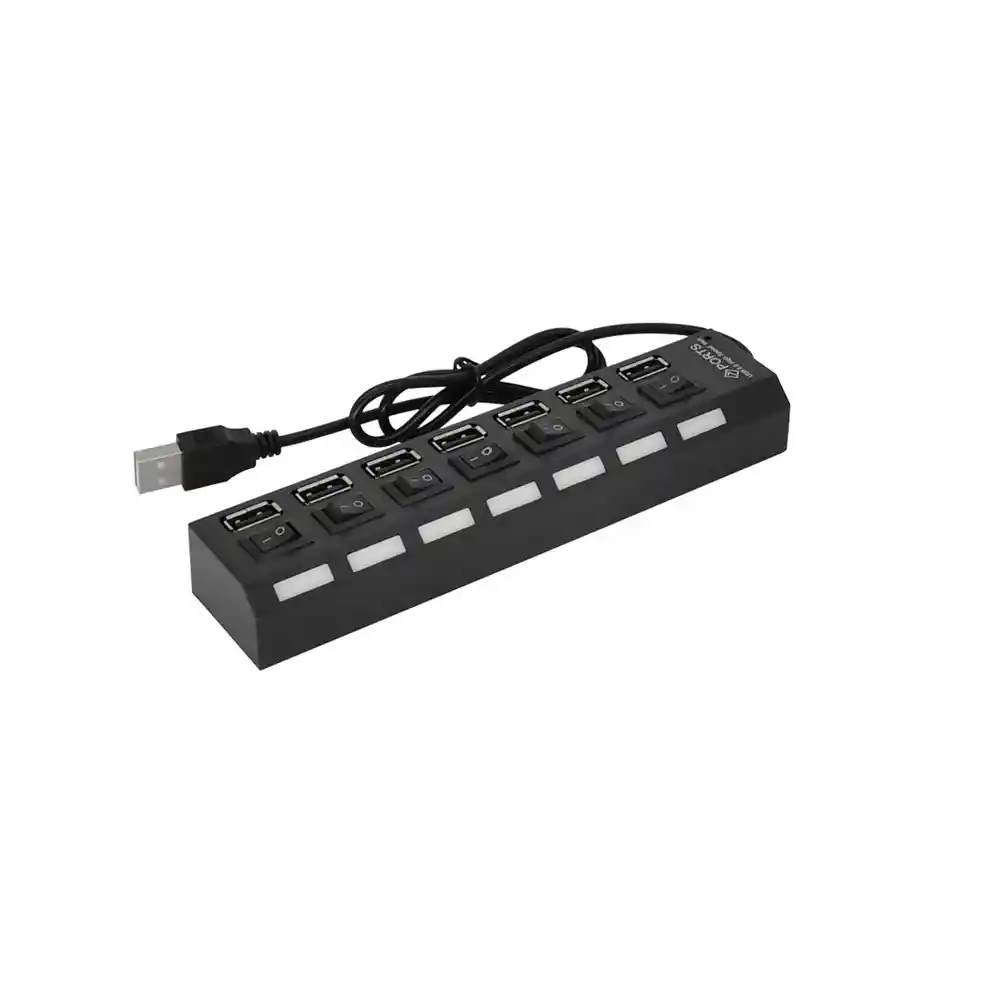 \Adaptador USB 2.0 Ranura de 7 puertos, contiene Interruptor de encendido / apagado Luz LEDExpanda la conectividad de su computadora con este concentrador USB de 7 puertos con interruptor de encendido / apagado. Diseñado con 7 puertos, este concentrador compacto USB 2.0 de alta velocidad es lo suficientemente pequeño para viajar y lo suficientemente capaz para satisfacer sus necesidades de conectividad. Conecta y reproduce; no se requiere driver. Los interruptores ON / OFF activan o desactivan puertos individuales. Las luces indicadoras LED muestran qué puertos USB están en uso en un momento dado. Cable USB incorporado Color: Negro Admite: Windows 7 / Vista / XP / 2000 y Mac OS X 10.2 y superior / Linux 9. Tamaño: 16.5x3.5x2.2cm Longitud del cable: 55cm\