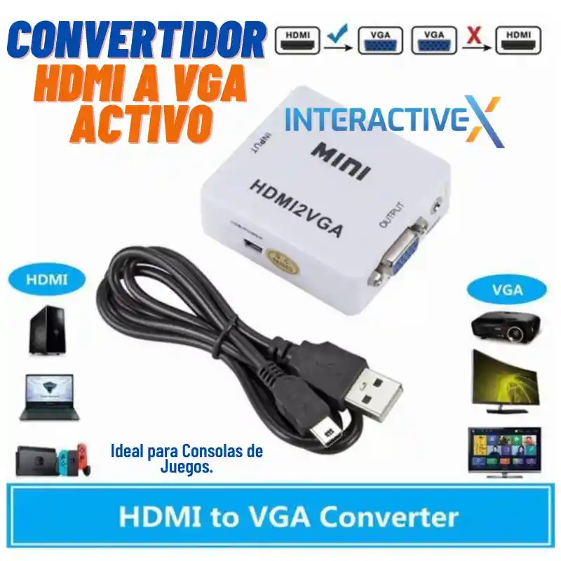 Adaptador Convertidor conector de HDMI a VGA Activo Con entrada de audio 3.5mm. para usar y convertir la señal de un dispositivo con salida HDMI (Computador, Portatil, Consolas) y convertir para un dispositivo con entrada VGA (pantalla, Proyector, Televisor). NOTA. No funciona de forma inversa (VGA a HDMI). Para este caso tenemos el adaptador que cumple esa función. Las especificaciones 1 puerto de entrada: 1 HDMI 2 Interfaz de salida: 1 VGA 1 de audio analógico (de 3,5mm para auriculares jack) 3-entrada de energía: DC 5V 4 en la entrada de video formato: Atención: La conexión HDMI debe ser conectada y emitida desde PC, Portatiles, consolas y demás Hacia una conexión VGA de un Monitor o Pantalla