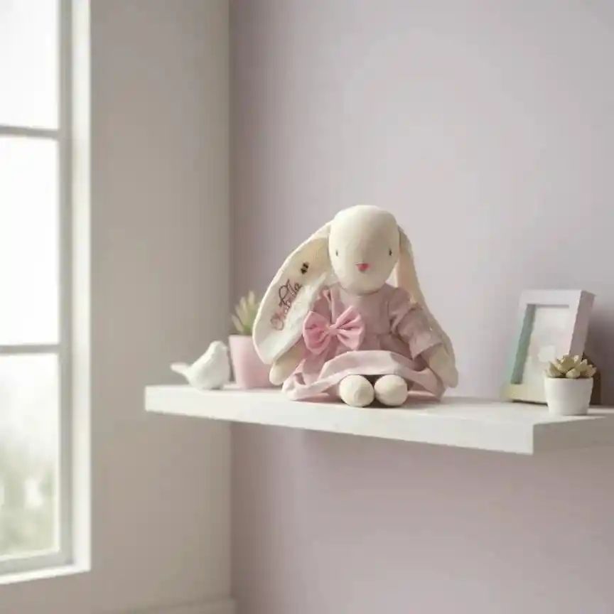 Conejita de peluche con vestido rosa para habitación infantil Esta dulce coneja de peluche hecha a mano viene con un delicado vestido rosa y un gran lazo al frente, ideal para decorar la habitación de tu bebé y convertirse en su compañera favorita de abrazos y juegos. Su expresión tranquila, sus largas orejas y sus tonos suaves la convierten en un detalle perfecto para cuna, repisa o rincón de lectura.