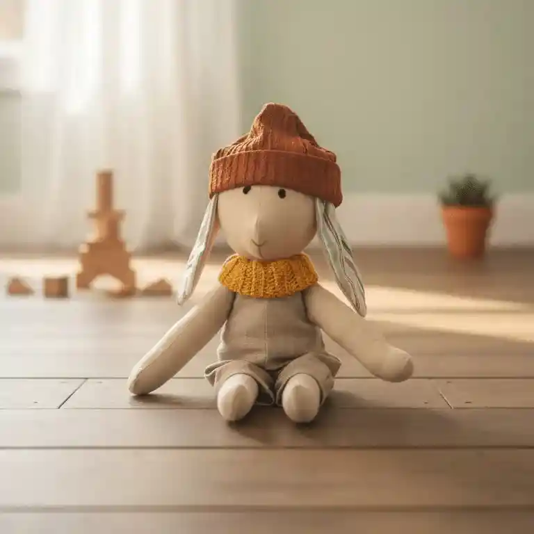 Conejito de tela artesanal con gorro para habitación infantil Este tierno conejito de tela hecho a mano luce un gorro color tierra y un cuello tejido mostaza que le dan un aire acogedor y otoñal. Su mono en tonos neutros y su diseño minimalista lo convierten en el muñeco perfecto para decorar habitaciones infantiles de estilo nórdico o Montessori. Muñeco de tela suave y seguro para niños Confeccionado con telas suaves al tacto y relleno ligero, este conejito está pensado para que los niños puedan abrazarlo, jugar y llevarlo consigo. Es ideal como regalo de baby shower, recién nacido o cumpleaños, y combina muy bien con mobiliario de madera y paletas de color naturales. Características principales Conejito de tela hecho a mano con acabado artesanal. Gorro de tejido grueso en tono terracota y cuello tejido mostaza. Mono en tonos beige que armoniza con decoraciones nórdicas. Ligero y suave, perfecto para abrazar, jugar y acompañar la lectura. Cada pieza es única: pueden existir ligeras variaciones propias de lo hecho a mano.