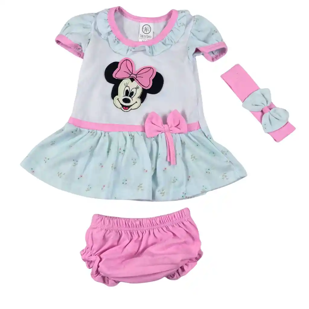 Este encantador conjunto para bebé está confeccionado en 100% algodón, ideal para la piel delicada del recién nacido. Diseñado para bebés de 0 a 3 meses, combina suavidad, frescura y comodidad para el uso diario o para ocasiones especiales. El vestido presenta un delicado color azul pastel con detalles rosados, mangas con olanes y un hermoso estampado bordado de Minnie Mouse, que le da un estilo tierno y femenino. Incluye un short tipo bloomer que brinda comodidad y libertad de movimiento, además de una balaca a juego que completa el look. Es un conjunto práctico, ligero y perfecto para climas cálidos, sesiones de fotos o como regalo para recién nacida. ¿Qué contiene el conjunto? 1 vestido con estampado de Minnie Mouse 1 short tipo bloomer color rosado 1 balaca a juego Material: 100% algodón Talla: 0 a 3 meses Textura: Suave, transpirable y cómoda
