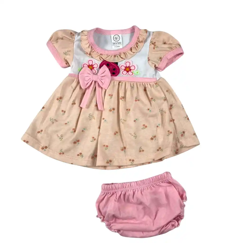 Hermoso conjunto para bebé talla 0-3 meses en tono beige claro con delicado estampado floral en pequeños detalles, combinado con acabados rosados. El vestido cuenta con mangas cortas, cuello con pequeño volante decorativo y un hermoso moño rosado en la parte frontal, acompañado de aplicaciones de flores que le dan un toque dulce y femenino. Incluye bombacho rosado a juego con elástico suave en la cintura para mayor comodidad. Tela ligera y cómoda, ideal para la piel delicada del recién nacido. Perfecto para salidas especiales, reuniones familiares o sesiones de fotos. ¿Qué llevas por tu compra? Tu compra incluye: 1 Vestido beige con estampado floral y moño rosado decorativo 1 Bombacho rosado a juego Un conjunto delicado, cómodo y adorable para vestir a tu bebé con estilo desde sus primeros meses.