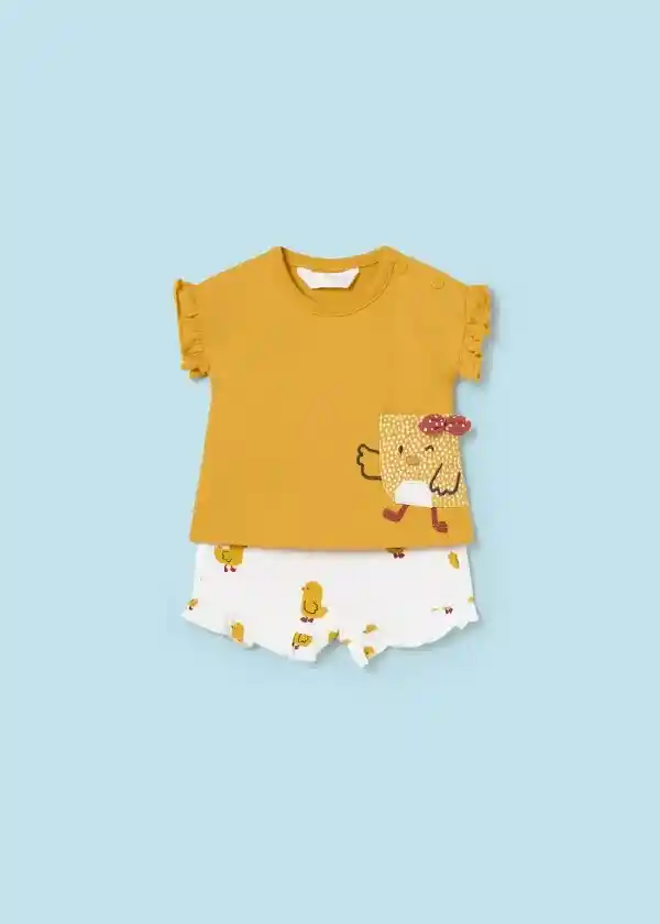 Camiseta de manga corta para recién nacido. Cuello redondo. Botones a presión en el hombro para facilitar la puesta de la prenda. Bolsillo funcional en la parte delantera. Pantalón de tipo short para recién nacido. Cinturilla elástica. Diseño con volantes decorativos en el bajo de la prenda. Diseño estampado.