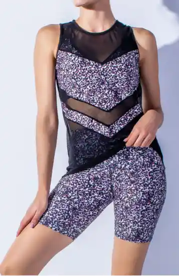 Blusa cuello redondo con cortes en animal print y tull, biker pretina alta con control de abdomen. TALLA ÚNICA