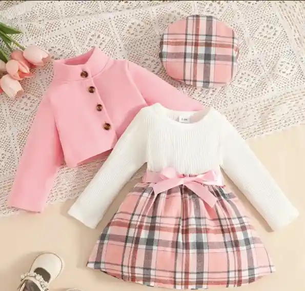 Conjunto 3 Pcs Elegante Niña Abrigo Rosa Falda Boina 3-4 Años