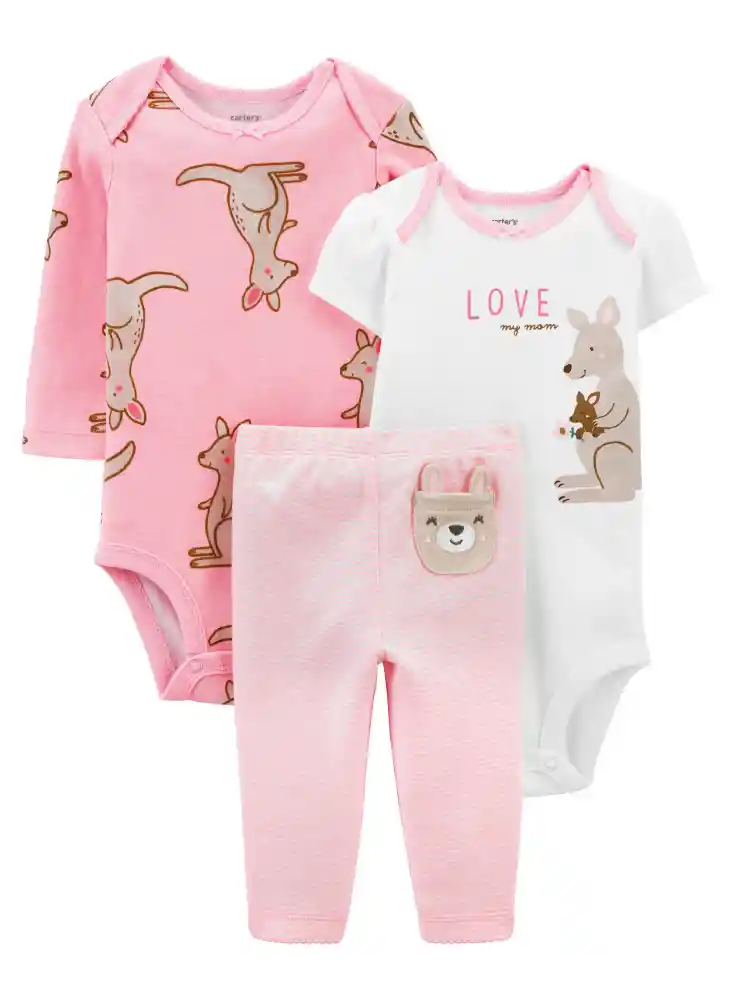 Confeccionado en algodón suave y cómodo, este conjunto se completa con dos monos y un par de pantalones sin cordones. ¡Perfecto para mezclar y combinar!