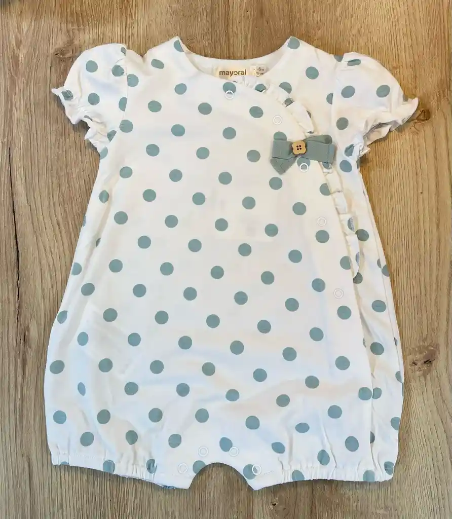 Pelele de manga corta para recién nacido. Cierre con bot�n a presión en la parte delantera. Botones a presión en la entrepierna para facilitar la puesta de la prenda. Estampado de lunares.